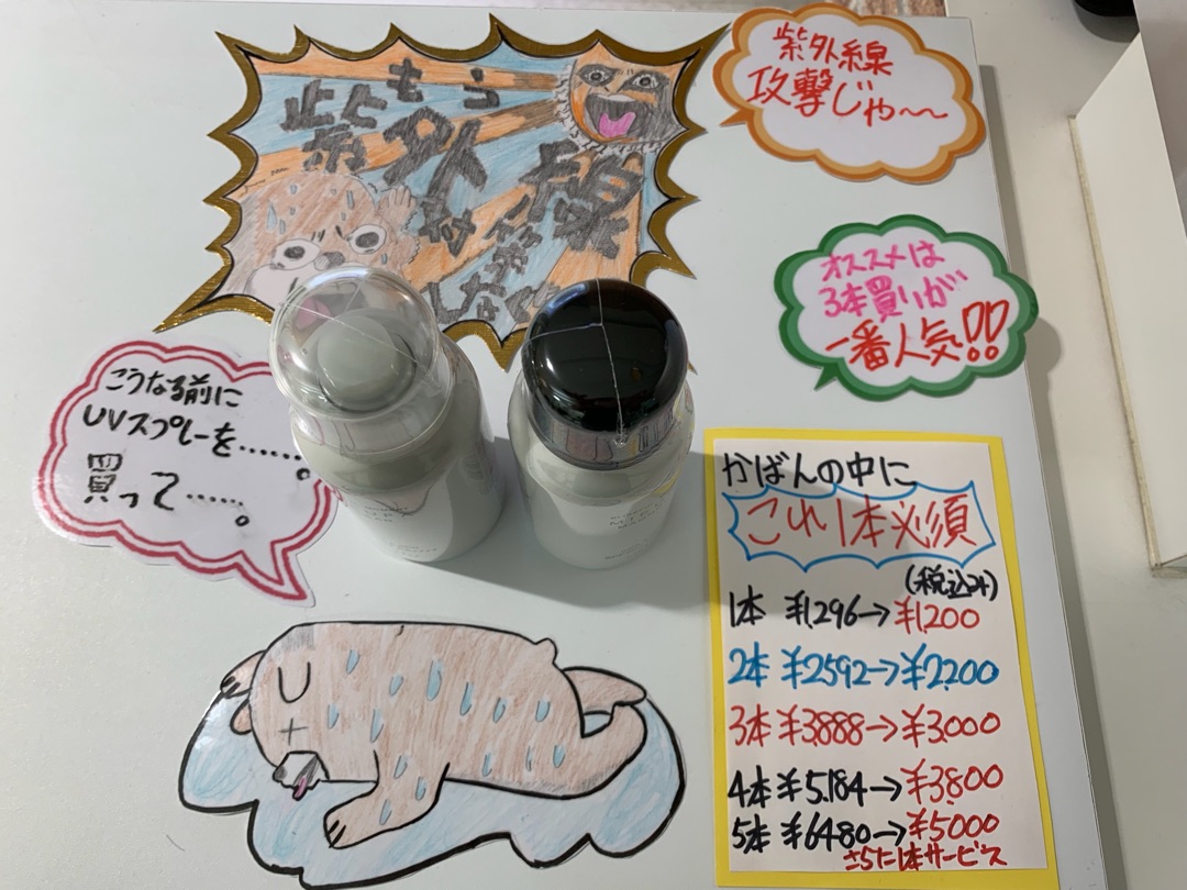 受付横にある棚をUVスプレーが占拠! 6月末までの期間と数量限定での企画です。