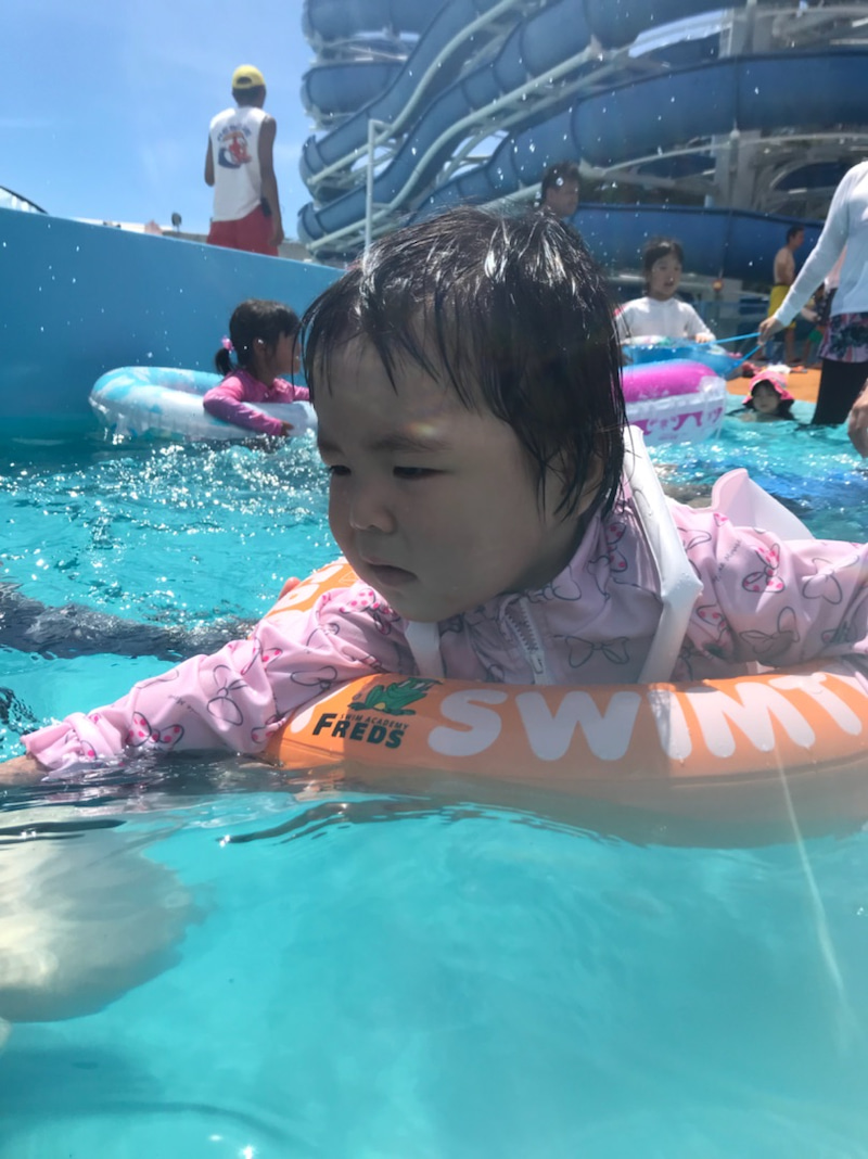 3人目も神妙な面持ちでプールを初体験。 ちなみにこの後、思いっきり泣いてましたけどね。