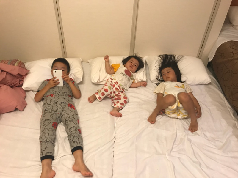 初のホテルでテンションMAXの次女。 真っ暗でも暴れまわって、なかなか寝なくって、もう大変。 でもね、隣の部屋も同じようにお母さんの「静かにしないさい!」の声が一番部屋に響いてきますけどね。