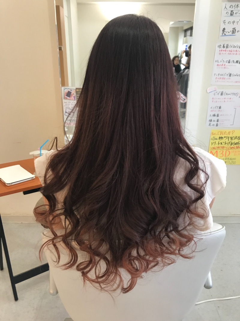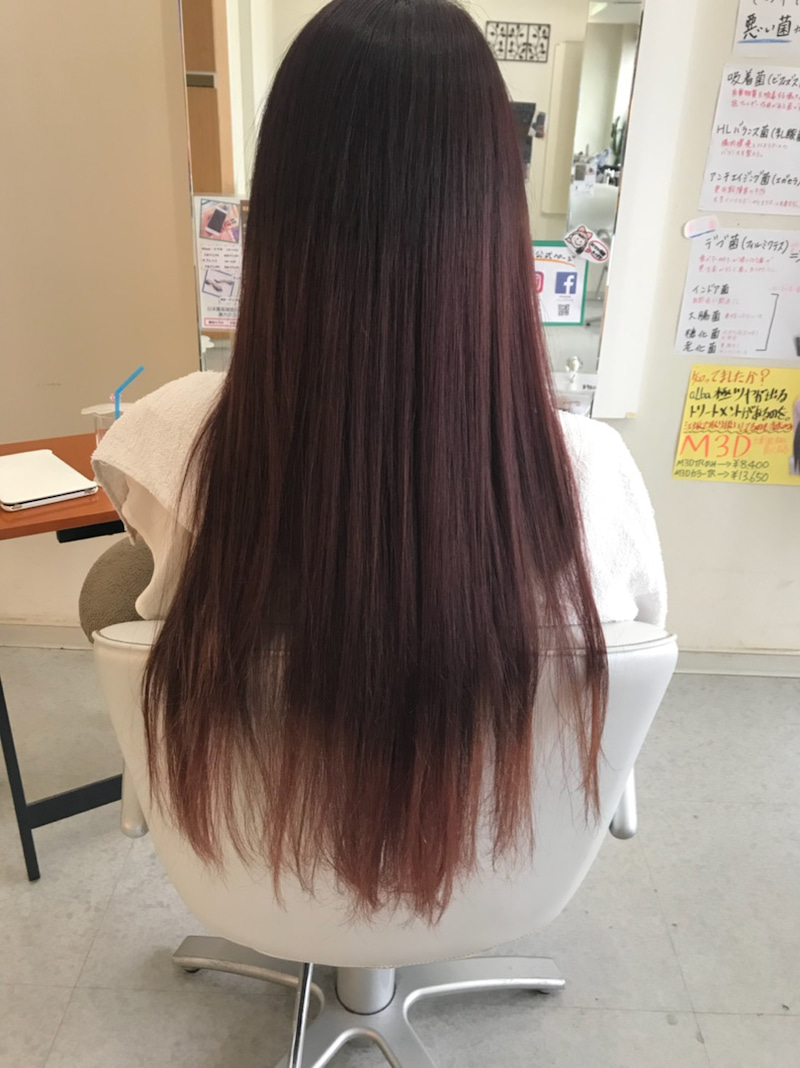こう見えても根本、中間、毛先と3段階の色の変化です。 根本は、ほぼ真っ黒に近い赤系のカラーでほんのりわかるように。 中間は、少し明るさを出して色味がわかるようにしています。 そして、毛先は、いったんブリーチをして脱色後にカラーを重ね塗りです。 なので色味は、かなりハッキリとわかるかんじなんです。