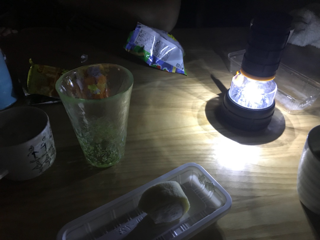そしたら14時に突然の停電。そこから暗黒の時間がやってきます。 外は、恐ろしい雨風。 家は、真っ暗。 ジタバタしてもしょうがないので、懐中電灯でおやつタイム。 子供たちは、ビビってますしね。