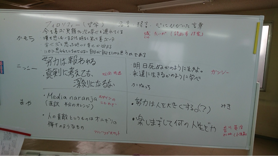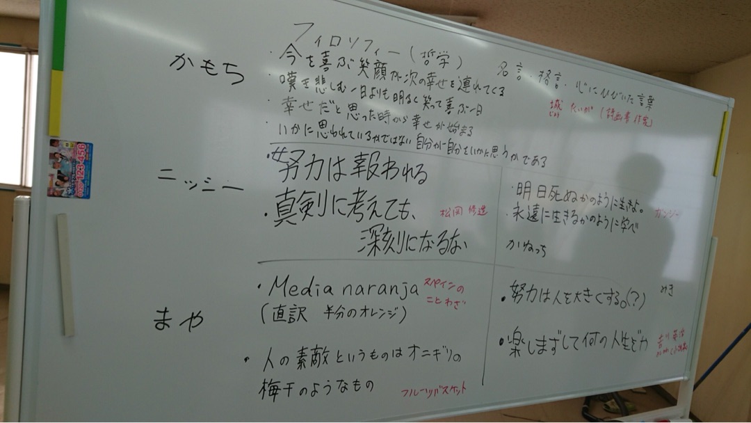 午前中はスタッフがそれぞれ自分がいいと思う格言、名言を調べ、なぜそれがいいと思ったかを