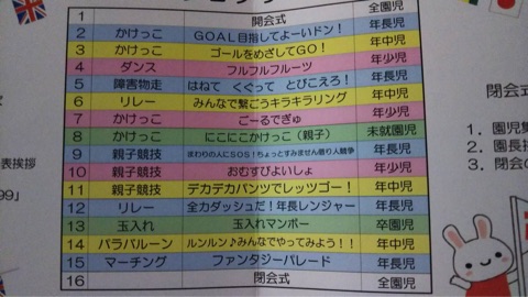 このプログラムを見てもわかるように、年少、年中、年長さんと色別になっているのですぐにわかる工夫がされています。