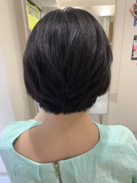 そして、仕上がりのスタイル。今回は、襟足をギリギリのところまで切らせてもらい、あとは、お手入れが簡単なるようにボブスタイにしました。 分け目を変えるとによりスタイルが可愛くも大人っぽい感じにも見えるのでおススメしてました。
