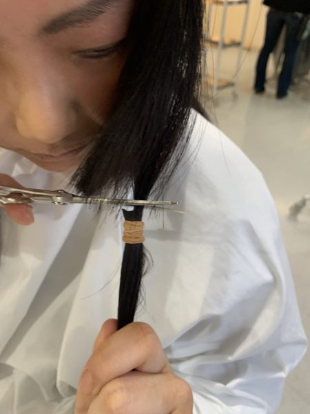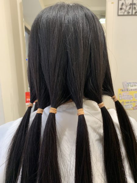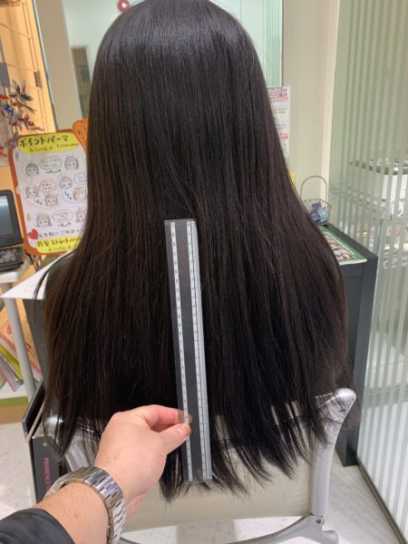 今回は、この長さでした。 綺麗に伸ばされていて、なんとなくもったいないような気がしました。 でも、ヘアドネーションとしては、最高の髪質。