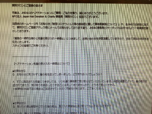 でもね、こんな時でもJHD &Cは、受け入れてもらえませんが、髪を切ってアルバで保管は、しておけます。 その際には、髪をしっかり乾燥させておいたり、1つ1つを袋に入れて保管しておきます。 そして、受け入れを再開された時には、ちゃんと送らせてもらいます。