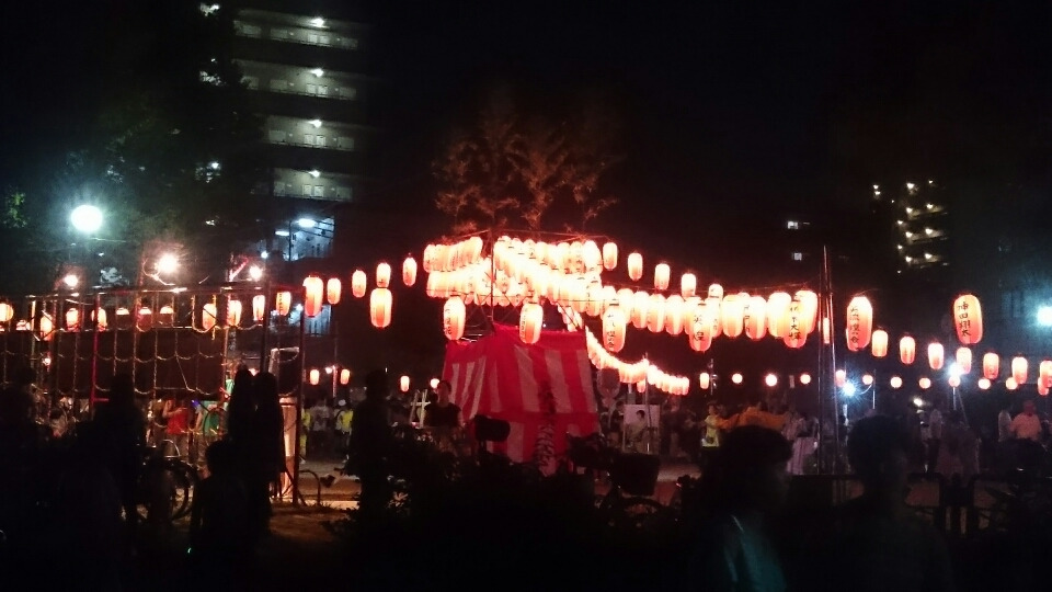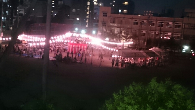 小学校前のグラウンドに櫓を組んで盆踊り。