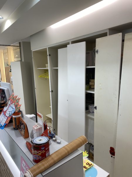 棚の壁紙の張り替えと、椅子のひじ置きのペンキ塗り替えです!