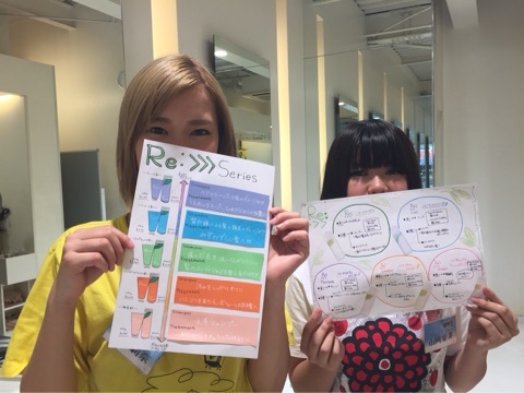 エルフォート美容室のかもちです(*^o^*)実習生のまなみちゃんとりなちゃんが新しい商品(シャンプー・トリート……