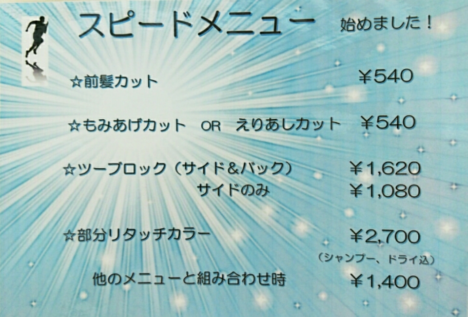 こんにちは。江坂の美容室 ヘア メイク アルバ の 兼武です。新しいメニューが登場しました!スピードメニューで……