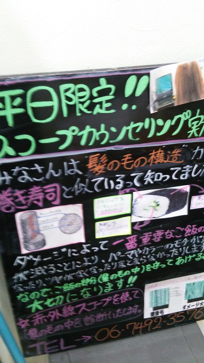 組東さんが黒板に新しいトリートメントの説明を、試行錯誤しながらつくっていただきました。カッパ巻きで例えるあたり……
