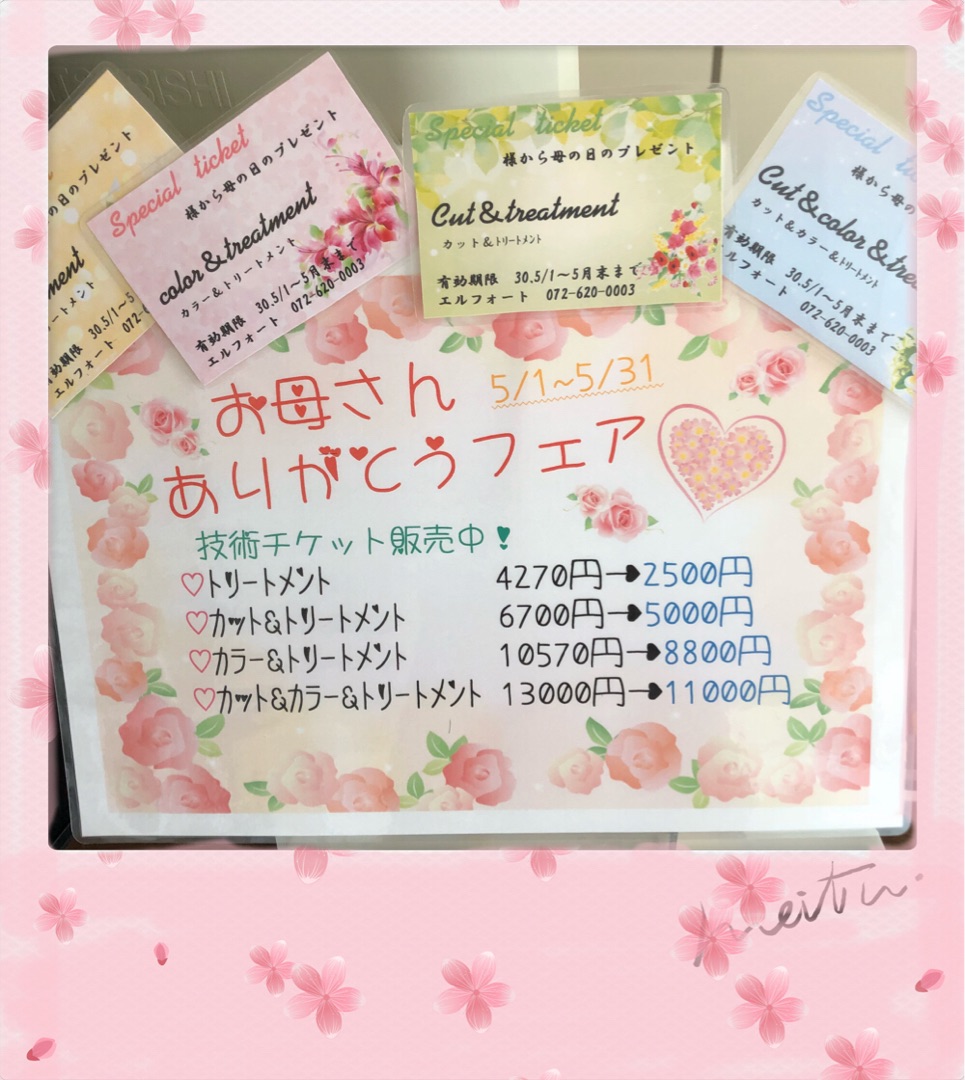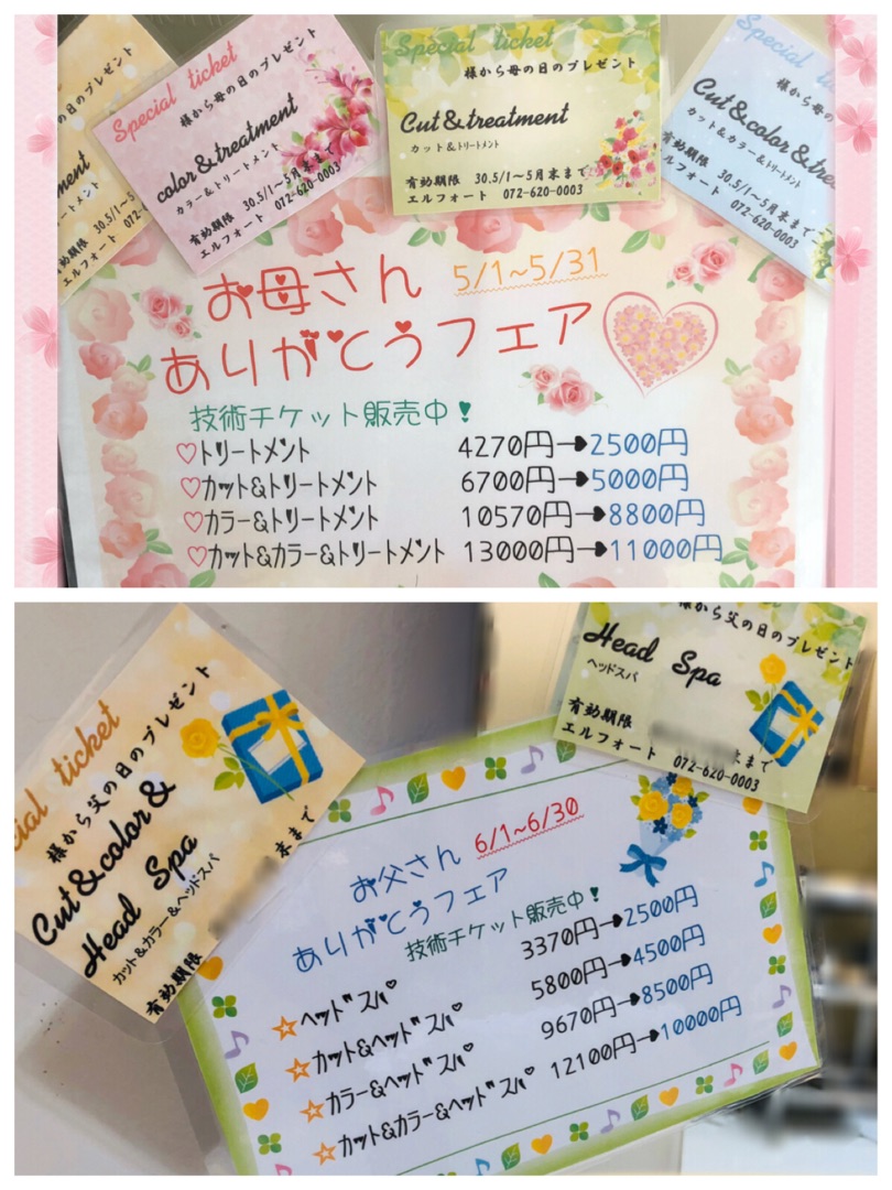 こんばんは✨✨✨阪急京都線 総持寺 エルフォート美容室 店長かもちです(⌒▽⌒)今月はお母さんありがとうフェア……